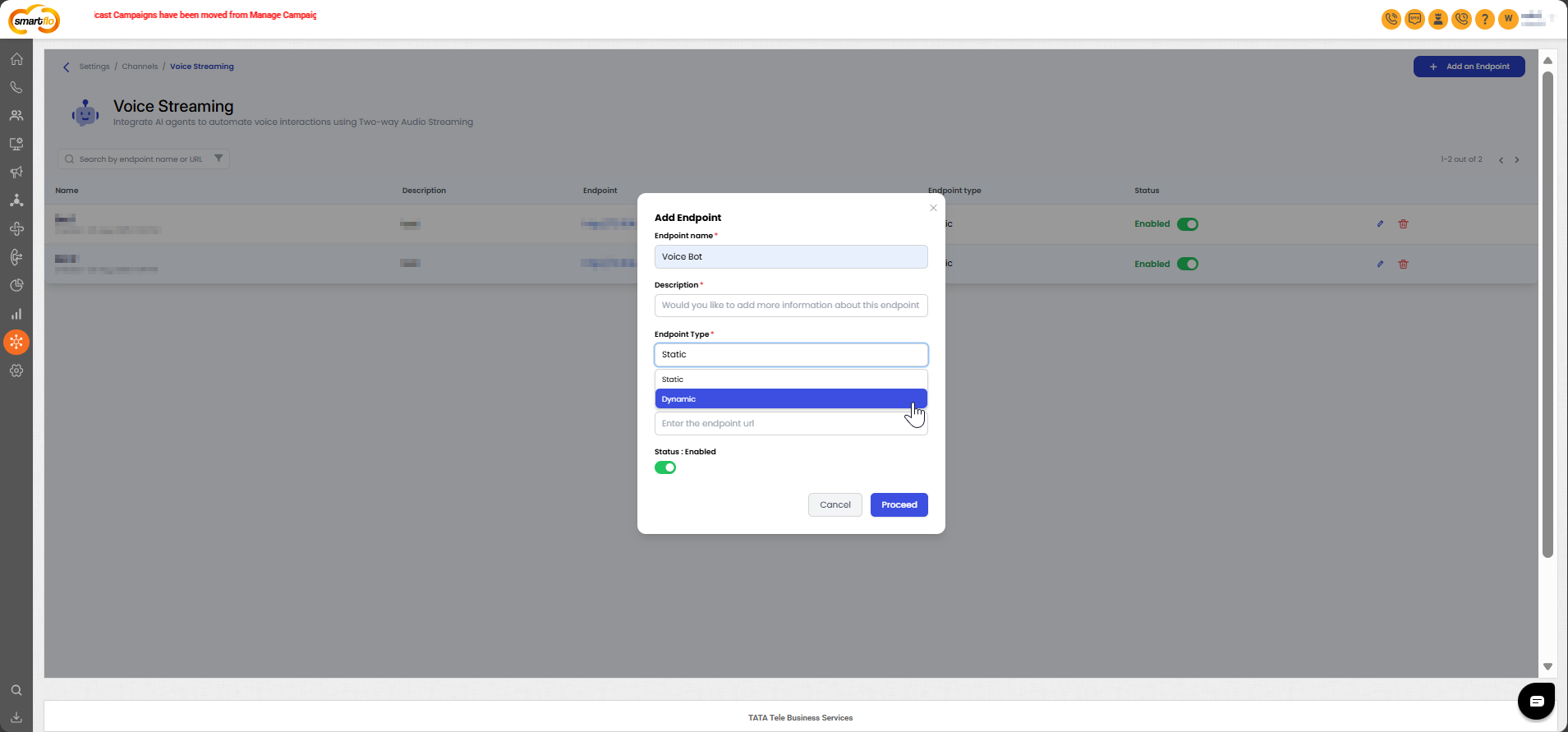 Before enabling inbound or outbound VOICE Streaming, you must set up an endpoint that tells the platform where to connect for two-way audio. You can choose either a Static or Dynamic endpoint depending on how your bot is hosted.