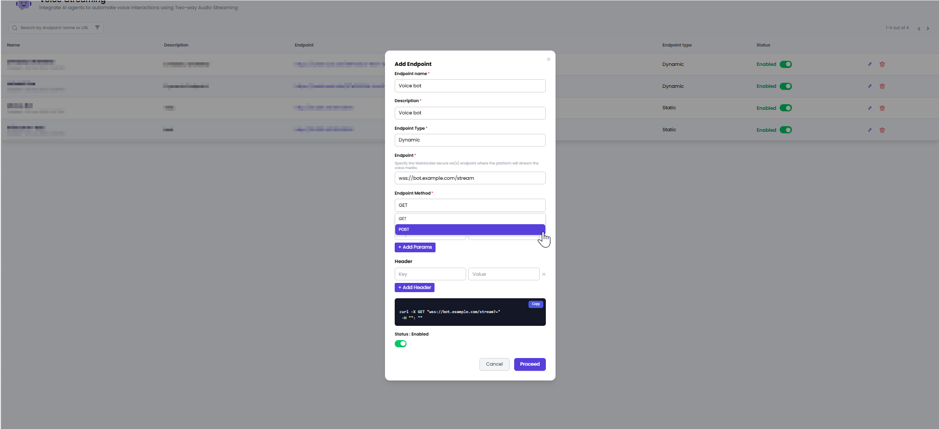 (Example:wss://bot.example.com/stream) - Save and Enable the endpoint