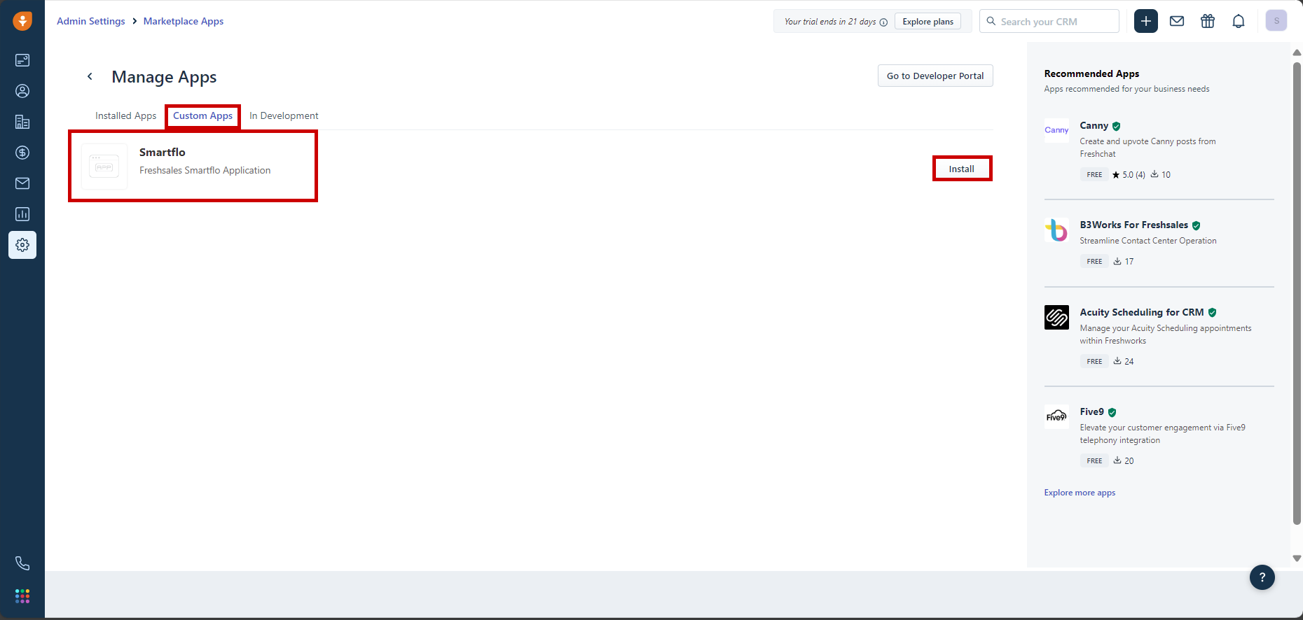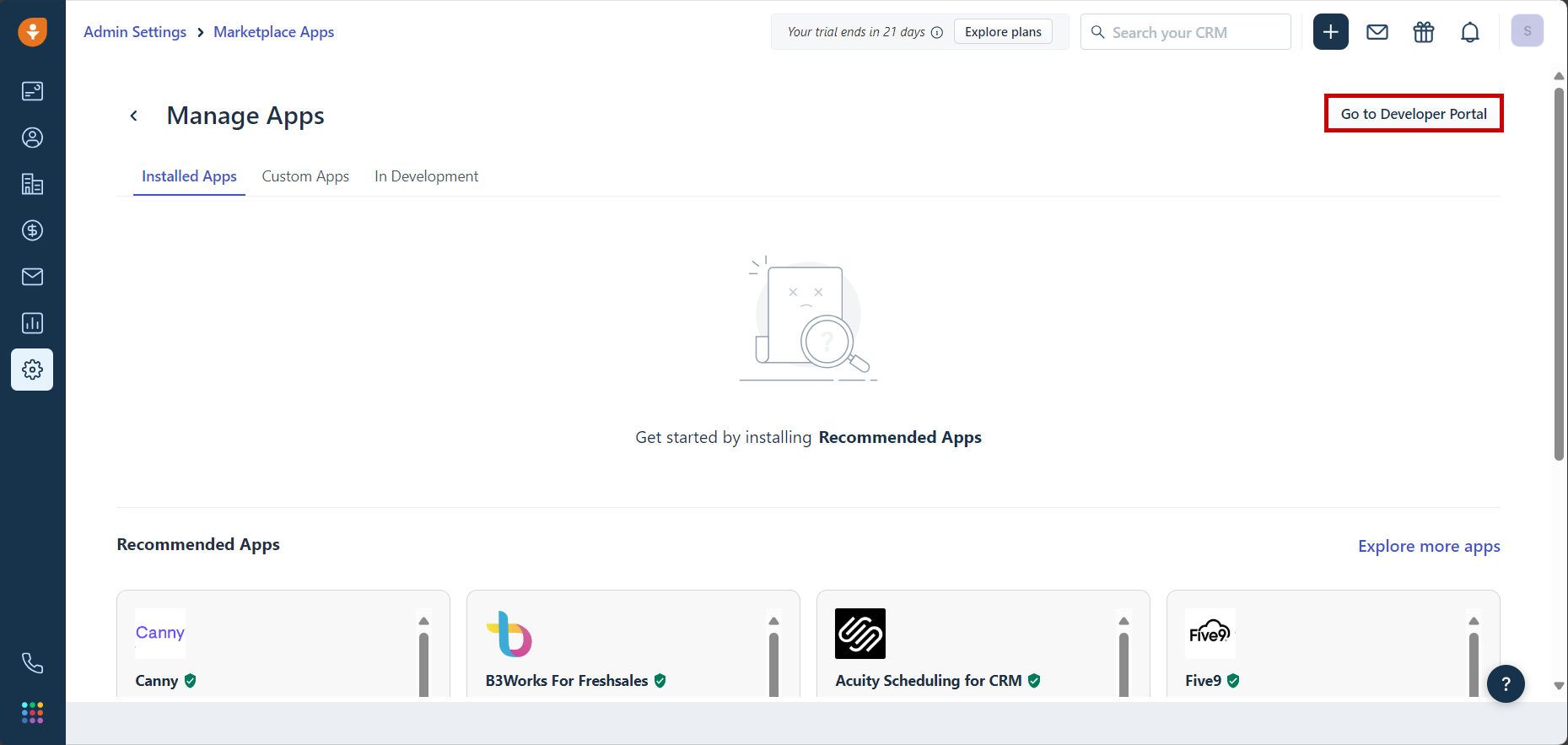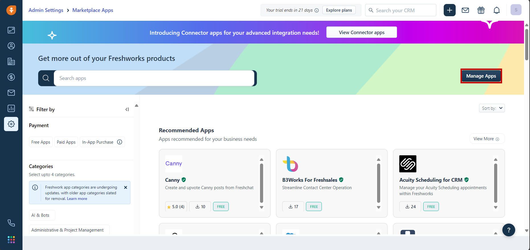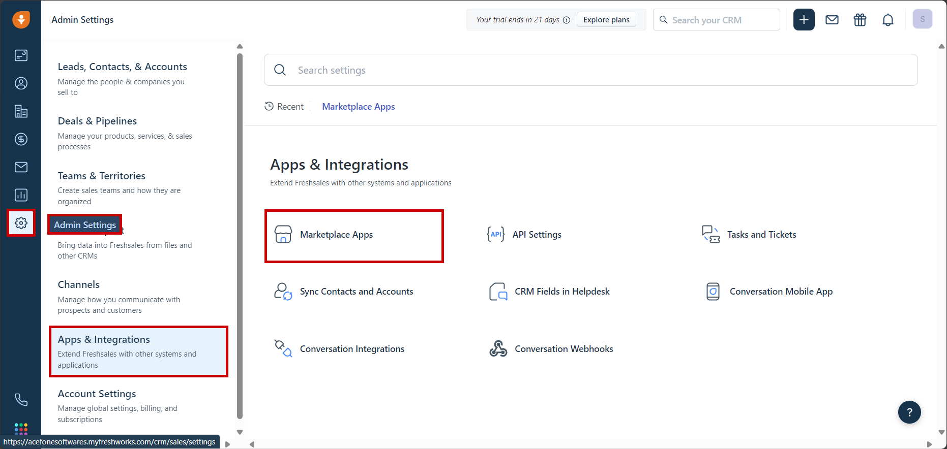 In Freshsales, navigate to Admin Settings>Apps & Integrations>Marketplace Apps from the side-navigation.