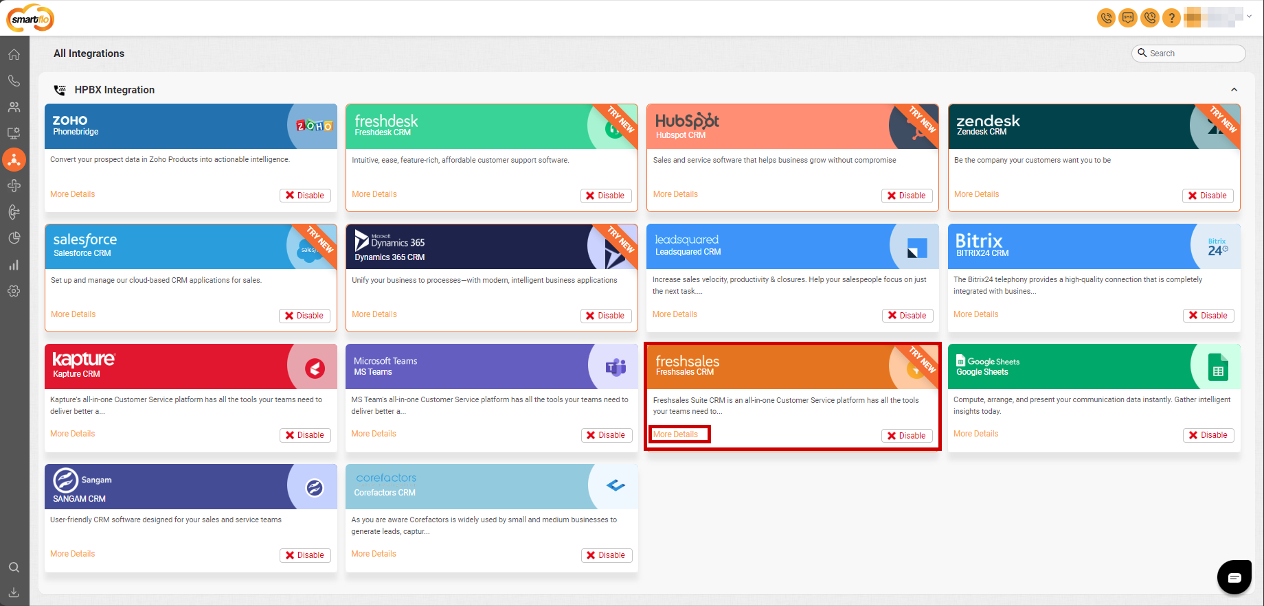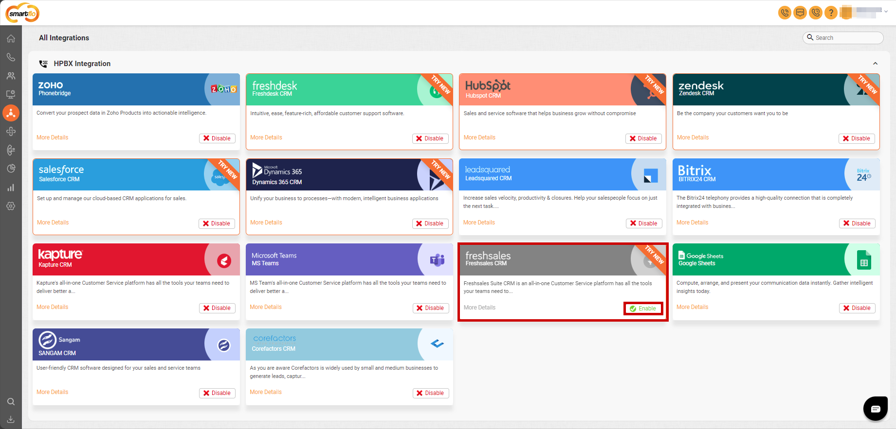 In HPBX integration, click on enable for Freshsales CRM integration.