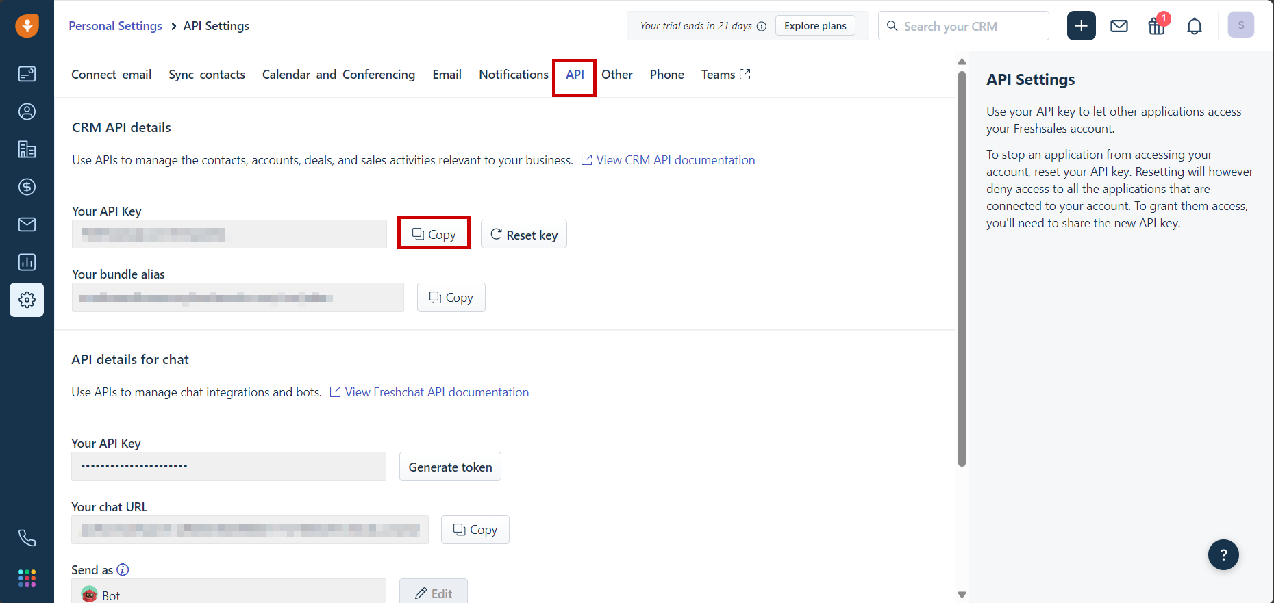 In personal settings, navigate to the API Tab from top navigation and copy the CRM API Key.