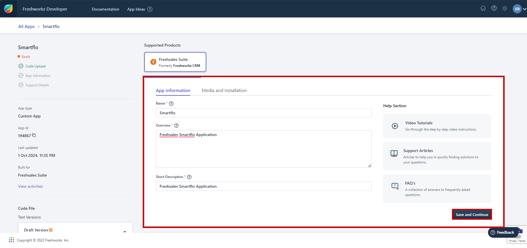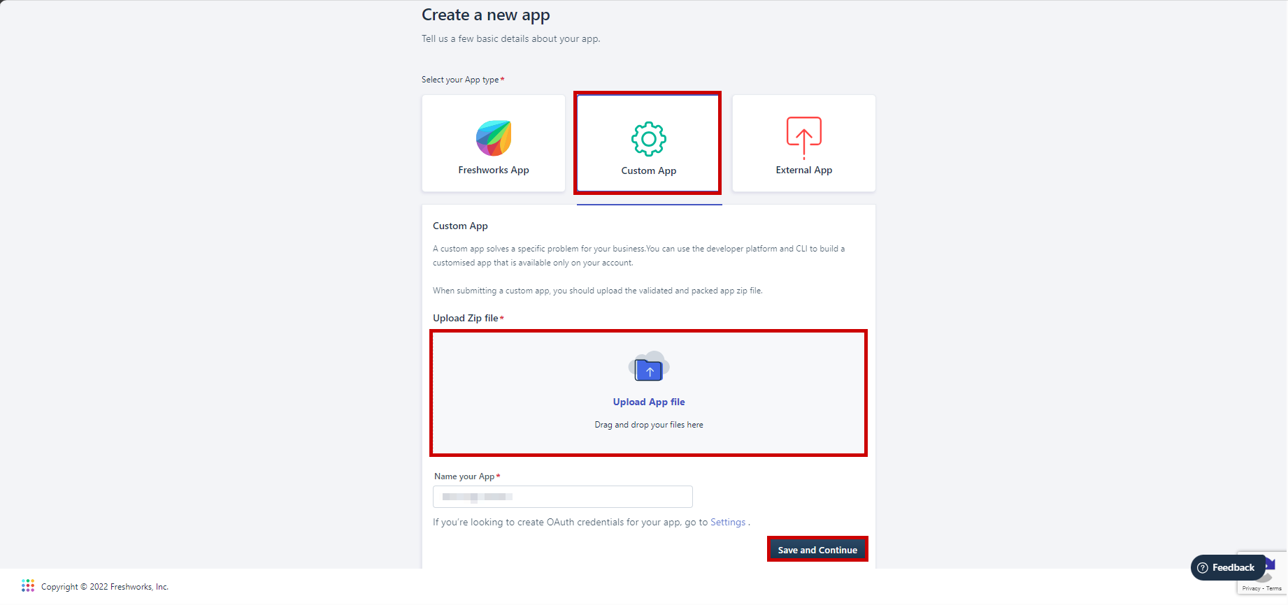 - To create a new app, select Custom App, upload your download package then name your application and click on Save and Continue.