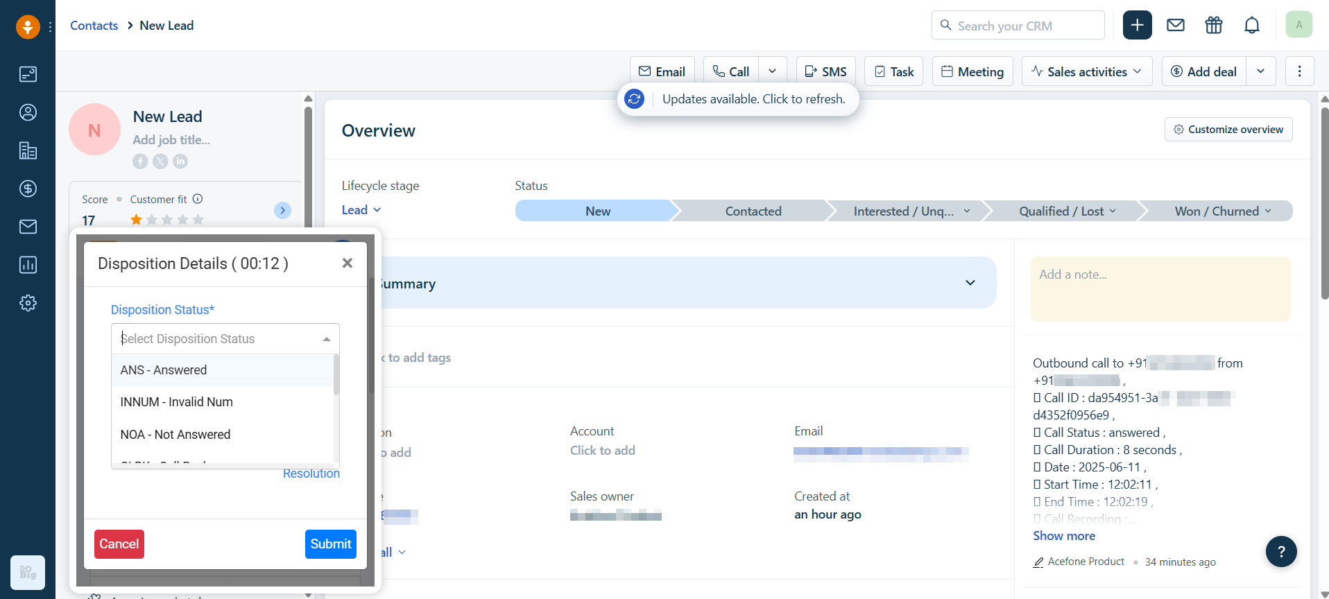After the call ends, fill in the Disposition Status and optional notes, then click Submit.