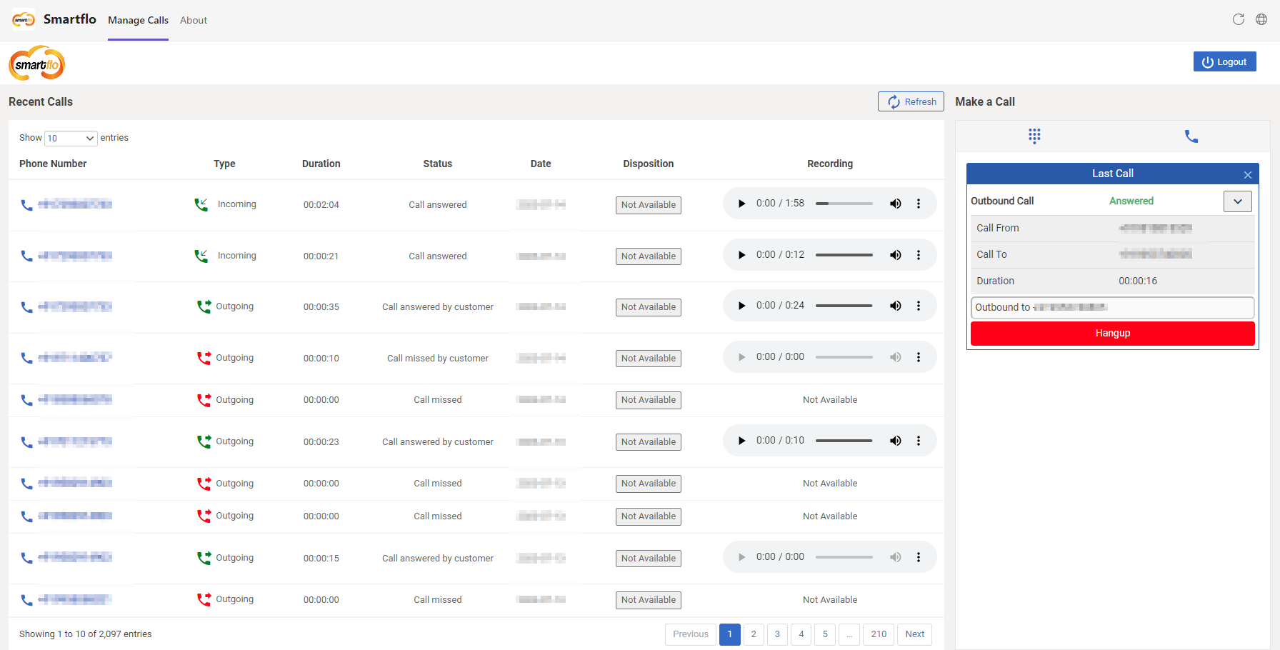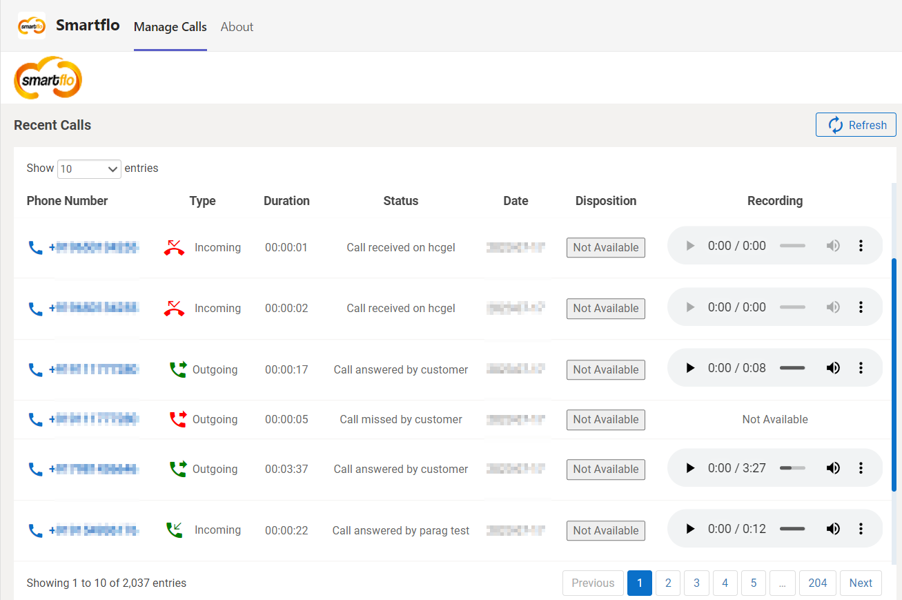 | Phone Number | The number from which the call is received or is dialed from our portal. |