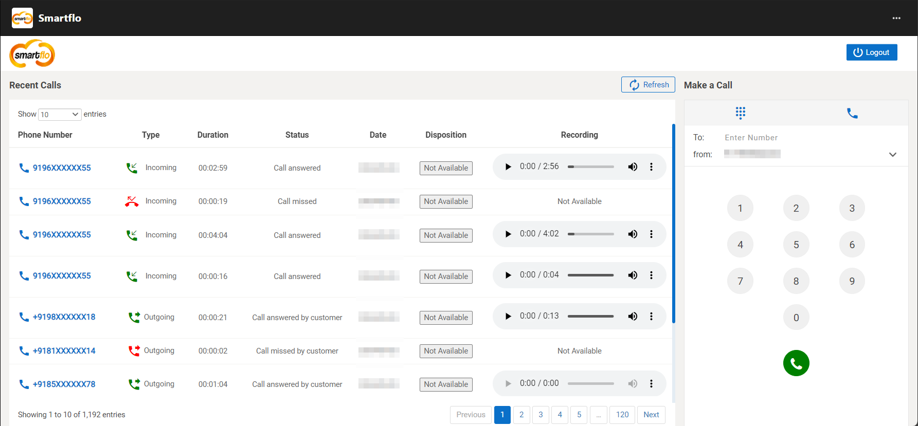 To use the Click To Call functionality, go to the Make a Call block in the side pane. Dial the number of your choice and select the DID number from which you want to make the call.