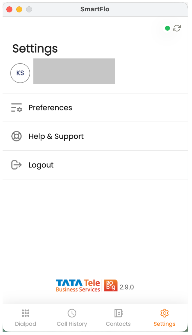 - Click on Settings to view your profile, get help, and log out from the Smartflo softphone.