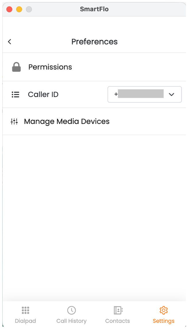 b. Click on ‘Preferences’ – it includes three sections: Permissions, Caller ID, and Manage Media Devices.